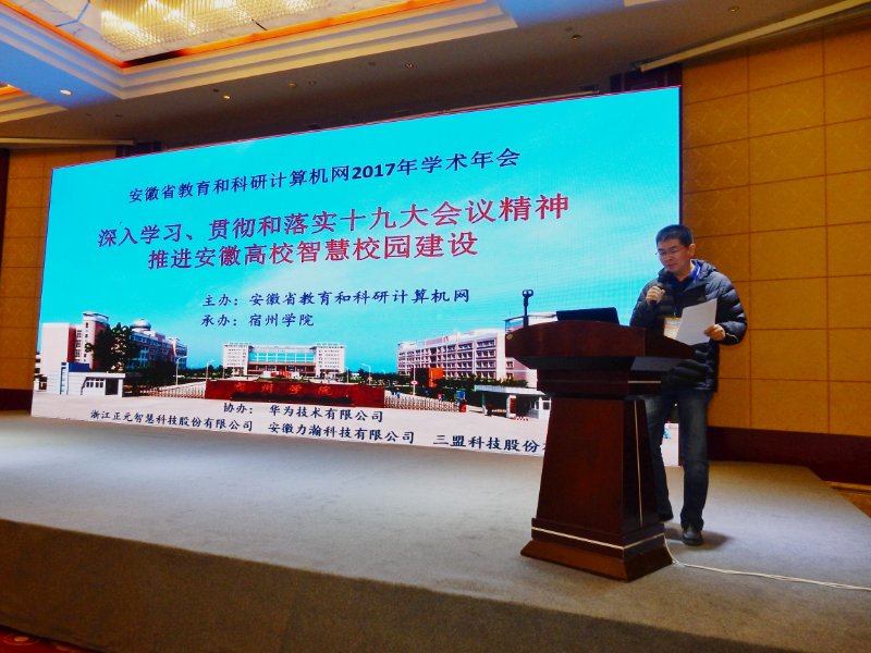 会上,首先由安徽省教育和科研计算机网网络中心主任李京教授对今年的省网工作进行了回顾和总结,介绍了2017年省教育和科研网运行情况及省网中心在信息化建设方面的重点工作,并提出了明年的主要工作计划与安排。之后,滁州学院信息技术与网络中心主任陈桂林教授作了题为“应用型高校课程共建共享的探索与实践”的专题报告,他介绍了省教育和科研网信息技术与教学融合工作组的成立和工作开展情况;他认为在信息化工作的新背景下,更多的新兴技术,大数据、人工智能等,带来了更多的挑战和更多的机会,并对2018年工作组的工作提出了初步的设想。中国科学技术大学网络信息中心徐兵副主任在“智慧校园-信息化基础平台建设与思考”的报告中,谈了对智慧校园的理解与认识,用感知、汇聚、处理和服务这四个关键词描绘了智慧校园的特征,对智慧校园的信息化基础平台建设和应用场景提出了设想与规划方案。省教育科研网网络中心的张焕杰副主任在会上,给大家介绍了一种开源的、功能强大且方便易用的分布式版本管理软件GIT及衍生产品,该软件在大家编制文档、编写代码等工作中可以作为版本管理的一种锐利工具,极大地提高效率和减少错误。赛尔网络安徽省分公司的张炎谨总经理(兼任省教育科研网网络中心副主任)介绍了中国教育和科研计算机网近一阶段的建设、运行和发展情况,宣讲了中共中央办公厅、国务院办公厅印发《推进互联网协议第六版(IPv6)规模部署行动计划》的战略作用和重要意义,展示了CERNET对高校信息化建设的服务项目以及科研支持。会议最后,由承办单位宿州学院办公室网络与信息中心余晓永主任为大家介绍了宿州学院信息化建设的近况与心得。会议中,协办单位华为技术有限公司还作了题为“智慧校园2.0助力教育现代化”、“华为双活数据中心助力高校智慧校园建设”、“极致体验安全校园”等专题技术报告;安徽力瀚科技有限公司作了题为“智慧数据感知校园”的技术报告;三盟科技股份有限公司作了题为“大数据技术在智慧校园的应用与实践” 的技术报告;浙江正元智慧科技股份有限公司作了题为“未来校园下的一卡通解决方案与交流” 的技术报告。
